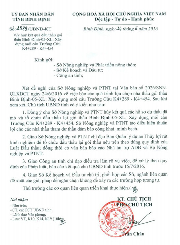Công văn đồng ý hủy kết quả đấu thầu gói thầu Bình Định-05-XL: Xây dựng mới cầu Trường Cửu K4+289 – K4+454