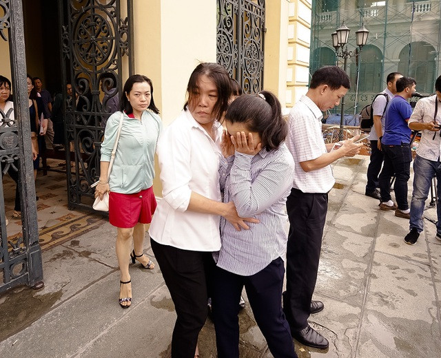 Bị cáo Phan Thị Cẩm Loan né ống kính phóng viên, ôm mặt chạy va vào bị cáo Lê Thị Vũ Phương