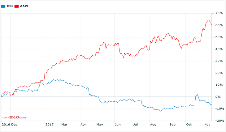 Ông đã rót hơn 10 tỷ USD vào cổ phiếu IBM năm 2011, đưa cổ phiếu này trở thành một trong những khoản đầu tư lớn nhất của Berkshire. Cho dù doanh thu và giá cổ phiếu của IBM sa sút, Buffett đã cố gắng bảo vệ quan điểm của mình cho tới khi thừa nhận sai lầm vào tháng 5 năm nay.