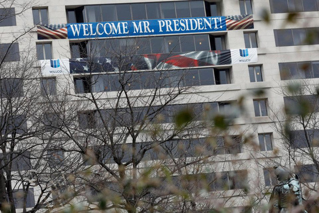 Băng rôn với dòng chữ “Chào đón ngài Tổng thống” được căng tại một tòa nhà cao tầng ở Washington (Ảnh: Getty)