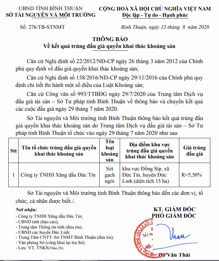 Sở Tài nguyên và môi trường Bình Thuận cho biết, Công ty TNHH Xăng dầu Đức Tín đã trúng đấu giá quyền khai thác khoáng sản nếu trên. Giá trúng đấu giá R=5,5%.