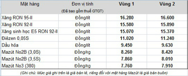 Quyết định điều chỉnh được đưa ra sau khi Liên Bộ Công thương - Tài chính có văn bản gửi các doanh nghiệp kinh doanh xăng dầu cho phép tăng giá. Theo đó, giá bán mỗi lít xăng RON 92 sẽ phổ biến ở mức 15.580 đồng, E5 là 15.070 đồng. Mức giá bán lẻ cụ thể được Petrolimex áp dụng đối với các mặt hàng khác như sau: