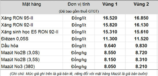 Như vậy so với mức áp dụng trước đó, mỗi lít xăng RON 92 được tăng giá 240 đồng. Giá bán lẻ mới được Tập đoàn Xăng dầu Việt Nam (Petrolimex) áp dụng cụ thể như sau: