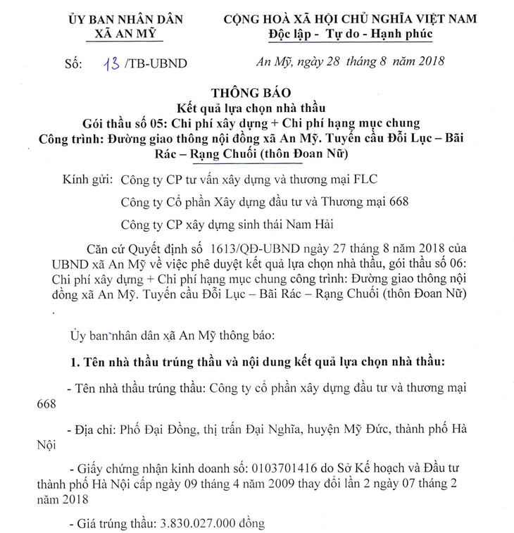 Trước đó, vào ngày 4/9/2018, nhà thầu này được lựa chọn trúng 5 gói thầu do UBND xã An Mỹ làm chủ đầu tư. Trong đó lớn nhất là Gói thầu Xây dựng thuộc Dự án Cải tạo, nâng cấp đường giao thông từ Chùa qua đường TL419 đến Cầu Cống Dụt, với giá trúng thầu 4.099.337.000 đồng. 2 kết quả trúng thầu còn lại được công bố cùng ngày 20/8/2018.