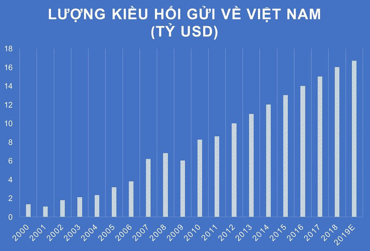 Theo công bố từ Ngân hàng Thế Giới, năm 2019, lượng kiều hối về Việt Nam ước đạt 16.7 tỷ USD. Năm 2019 cũng là lần thứ 5 Việt Nam lọt vào top 10 nước nhận kiều hối lớn nhất thế giới. Dòng kiều hối về Việt Nam đã tăng đáng kể từ 13.8 tỷ USB năm 2017 và năm 2018 tăng vọt lên 16 tỷ USD. Thống kê cũng cho thấy có ít nhất 25% lượng kiều hối đầu tư vào bất động sản hàng năm. Ngoài giao dịch trực tiếp, đa phần kiều bào nhờ người thân mua nhà đất hoặc đầu tư tại các dự án bất động sản. Theo nhận định, con số kiều hối đầu tư vào bất động sản dự kiến sẽ tăng mạnh trong năm 2020.