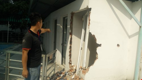 Bức tường nhà tắm tại chung cư 4S Riverside bị nhóm côn đồ đập phá - Ảnh: Công Nguyên